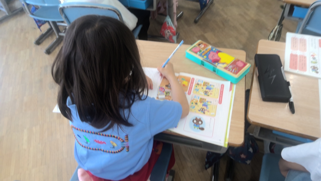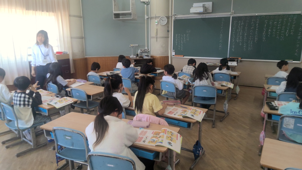 授業ルールの中に入っていたのが、「aeiouの歌」。授業始めに、身体をほぐし、発声しやすくするためのルーティーン活動です。