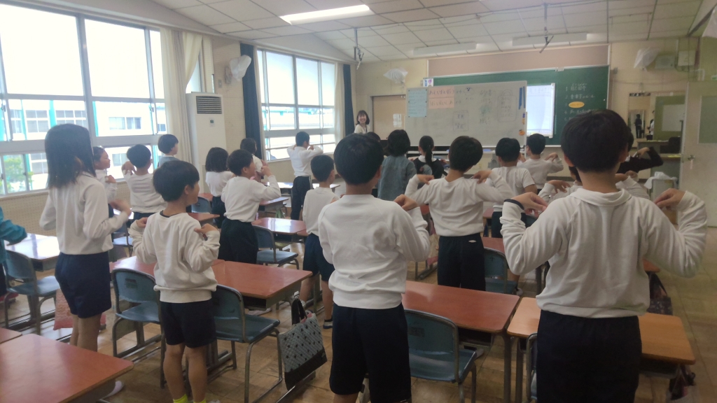 首や身体を伸ばしたり曲げたりする軽いストレッチやジャンプなどを軽快なピアノ伴奏に合わせて行います。4年生も自然とリラックスした表情に。