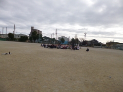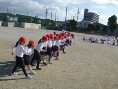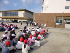 運動場で遊んでいた子たちは、遊び道具や水筒などをその場において、運動場中央にあつまり、しゃがんで揺れが収まるのを待ちました。