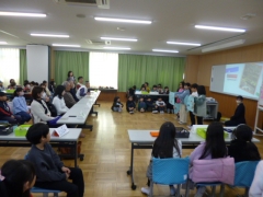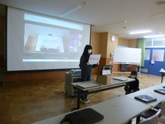 スライドを使い、山手中学校の学校生活のこと(授業や教科、テストのことや部活動のこと等)を教えてくれました。