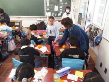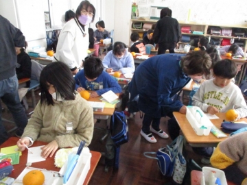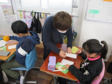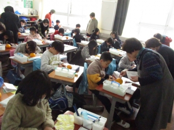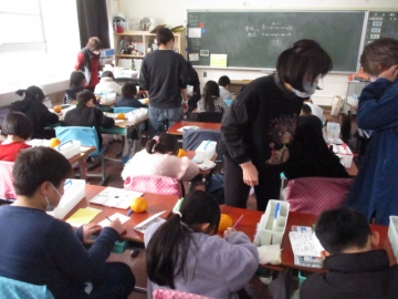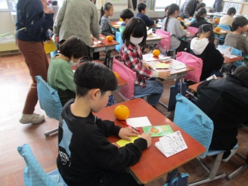 3年生が「すてきな町:川島」の学習では、誰にとっても住みよい町について考え合っています。今日は高齢者の生活についての学習でした。地域の絵手紙教室で活動する高齢者の方々に来ていただき、普段の活動の紹介を兼ねて3年生の子どもたちも体験しました。最初は「むずかしいそう」という声が聞こえてきましたが、しばらくすると「うまく描けたよ」「できた」等、楽しく作業を進めていました。
