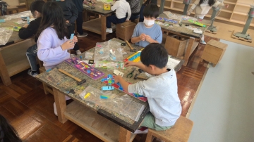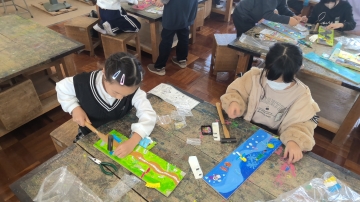 3年生は図工でコリントゲームを作っています。基盤となる板にはそれぞれがデザインを考え、色が塗られています。今日はその板に釘を金づちで打ち込んでいく作業をしていました。釘を打って実際に球を転がしてみると、同じところしか転がらなかったりすぐに止まってしまったりとうまくいきません。釘を打ち直しては球を転がす作業を繰り返していました。