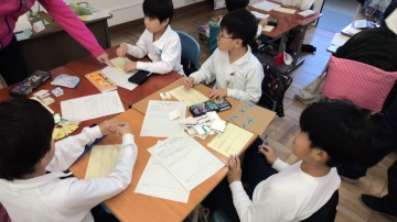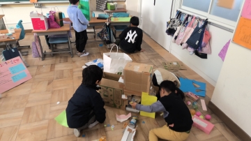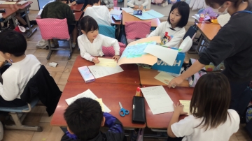 2年生は生活科で「おもちゃづくり」に取り組んでいます。昨年、自分たちが1年生の時にしてもらったように、自分たちで作ったおもちゃを使って1年生と一緒に遊ぶことが目的です。今日は作ったおもちゃで実際に遊んでみて、よりよくするにはどうしたらよいのかを考え合っていました。
