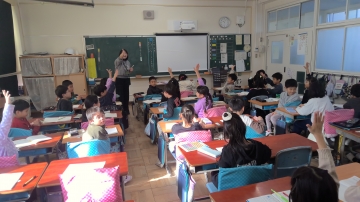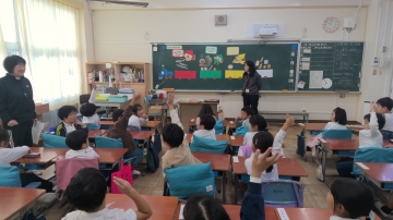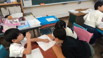 2年生の国語科の授業です。1組は主語と述語の学習をしていました。先生が準備した主語カードと述語カードがランダムに配られてそれで文を作ります。「校長先生」「アンパンマン」「サザエさん」「まるこ」など様々な主語カードと「なく」「書く」「ふむ」などこれまた様々な述語カードに子どもたちは大喜びで文を作っていました。2組は漢字集めをしていました。一画から十画までの漢字を時間内に集めます。班で協力して探していました。その後の発表でもたくさん手が挙がっていました。