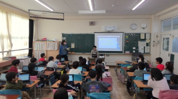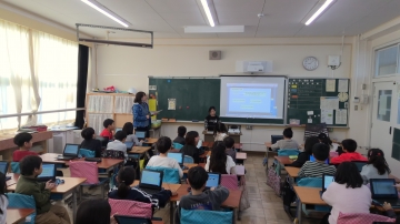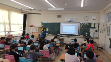 2年生が国語で「どうぶつクイズ」を出し合っていました。動物に関わる問題を自分で作り、それをタブレットに問題として書き込んだものを発表して出題していました。