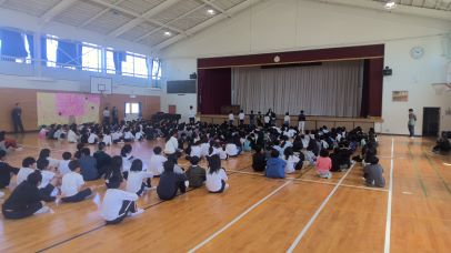今日の2限目は全校集会「1年生を迎える会」を行っています。