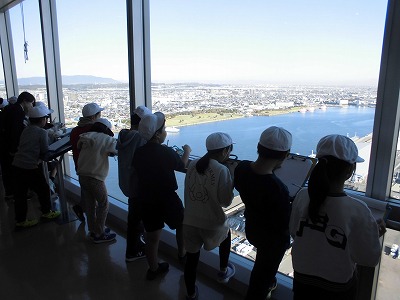 まずはポートビルを見学し、四日市港の歴史や船の種類、ポートビルから見える景色のことなどさまざまなことを学びました。船の模型などが展示されており、子どもたちは興味津々でした。