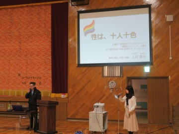 全校生徒を対象とした人権講演会を開催しました。この講演会はPTA家庭教育講座も兼ねたものです。講師には、公認心理師の上田直志さんをお招きしました。この講演会は、近年、性の多様性に関する理解が社会的に求められる中、思春期の子どもたちが自分らしく生きるためには、家庭における理解と支援が不可欠です。本講演会では、保護者が性の多様性について正しい知識を持ち、子どもとの関わり方を見直すきっかけとすることを目的として開催しました。LGBTQ+をはじめとする性の多様性の基本的な概念、思春期における子どもの心の変化、家庭での対応のポイントなどについて、事例を交えながら分かりやすくご講演いただきました。