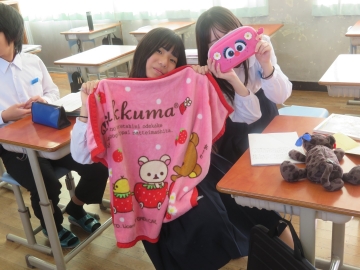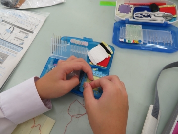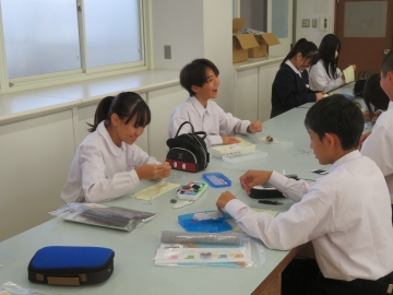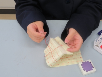 1年生の家庭科では、被服の分野をしています。針を使って、「なみ縫い、半返し縫い、本返し縫い」の練習をしています。針に糸を通す作業から悪戦苦闘していますが、少しずつ慣れてきました。