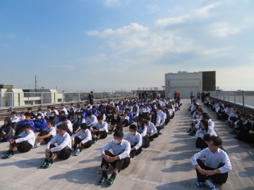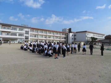 こども園、小学校、中学校の合同避難訓練を実施しました。訓練用緊急地震速報で、グラウンドに避難、その後津波警報が発表された想定で屋上への垂直避難をしました。目標の3分間でグラウンドへ、10分以内で屋上へ全員が避難することができました。