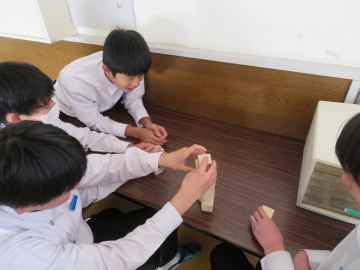 廊下には自学出来るコーナーでは、木製の立方体の積み木が置かれています。生徒たちの体験の場所であり、憩いの場所となっています。