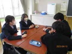 「自分を理解してお互いを知る」ということで、班で対話をしました。身を乗り出して、班員の話を聞いています。