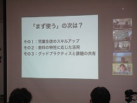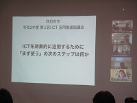 活用実践推進校公開授業研究会がおこなわれることもあり、本校が会場となっての推進会議でした。 市内の小中あわせて5つの推進校がZ00Mで集まり、各校の取り組み状況と成果や課題について報告し、中川教授からのアドバイスをいただきました。