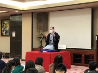 食後に落語体験をしました。林家花丸さんの落語です。一人で何人もの役をこなしたり、扇子と手ぬぐいだけでいろいろなものを表現したり…さすが名人芸です。『時そば』の落語では夢中になって聞き入っているみんなの表情が印象的でした。