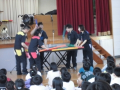 今日はNHK紅白歌合戦やテレビにも出場経験のある打楽器パフォーマンス「パーカッション パフォーマンス プレイヤーズ」略して「PPP」の皆さんによる芸術鑑賞会を行いました。低学年と高学年の2部制で行いました。