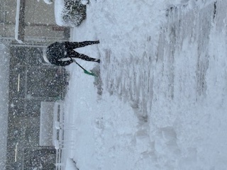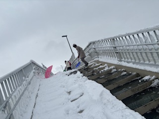 教職員で歩道橋などを、除雪しました。ジャンジャン降ってくるので、融雪剤をまきました。児童のみなさん、安全に無事に登校してください。