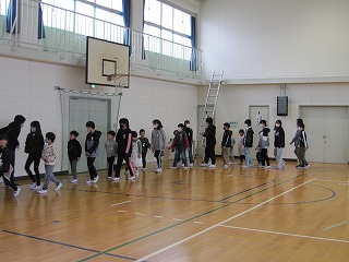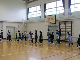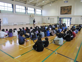 1年生と6年生は体育館で5月1日にある遠足のことを一緒に学びました。