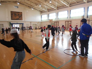 「おんせんオニ」とは、フラフープを温泉に見立てて、それぞれがフラフープ内に入り、保健委員が「おんせん!」と言ったら、他のフラフープに移動しなければなりません。