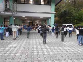 すがすがしい山の朝の空気をいっぱいに吸って、朝のつどいを行いました。