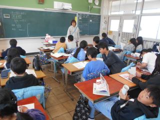 続いて離任式を行いました。去られる先生方からあいさつをいただき、子どもたちは寂しげにそれを聞いていました。