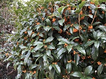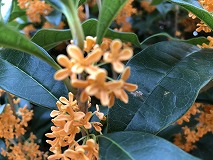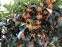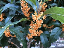 この花はキンモクセイ(金木犀)と思われます。常緑広葉樹の小高木で、ふつう高さ4m ほどになります。花期は9 ~10月[です。花は橙色の小花が、葉腋に多数集まって咲かせ、甘めでしっかりした強い香りです。雌雄異株の植物で、雌株は冬にクコの実ほどの小さな実を付け、熟すと紫色になります。日本では花付きの良い雄株しか移入されていないため実を結ばないようです。そのため挿し木で増やします。庭園樹や街路樹として植栽に使われています。
