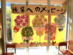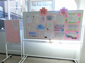 1階廊下に、卒業式にいただいた祝電や卒業生が1・2年生に向けて書いたメッセージが掲示されています。