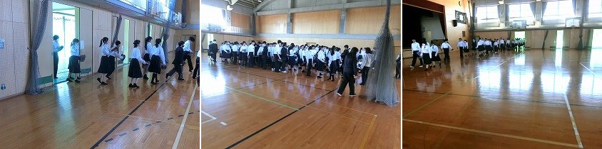 暗号のような放送で全校生徒に知らせ、各教室で施錠やその他の対応をし、その後、安全を確認したのちに体育館に避難しました。