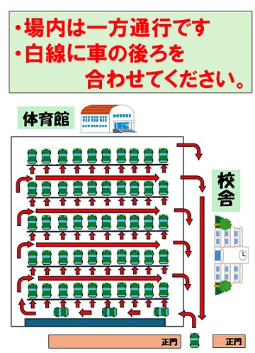 お車でお越しの際は図のように正門入ってすぐ左折してグランドに入って奥(体育館側)から詰めて駐車してください。敷地内は一方通行です。