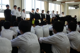 今日の練習では前回より一歩進めて、パート練習も合唱委員やパートリーダーが中心となって自分たちで進めていくようにしました。また、練習の最終には合唱委員が集まり、今日の成果と課題をまとめて、みんなの前で話しました。(写真下)