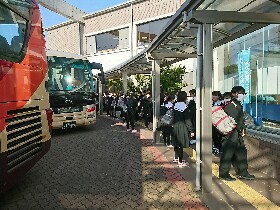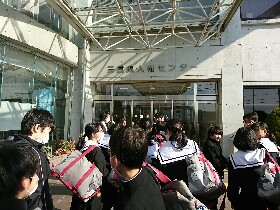 三重県人権センターに到着しました。全員とても元気です。今から入館し、各クラスごとの控え室に荷物を置き、ホールに集合します。