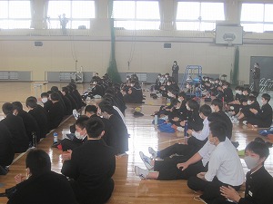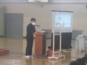 三滝祭の閉会式の後、明後日開催される三泗地区中学校駅伝競走大会に出場する選手の壮行会が行われました。選手の代表による挨拶でしたが、精一杯走ってきますという力強い言葉がありました。