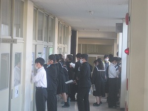 今日の展示見学は2年生が行いました。展示された物の中には、2年生の作品が多くあったからか、仲間と談笑しながら熱心に作品に見入り、用紙に感想を書き込む姿がありました。来年度の三滝祭では、合唱にしても展示発表にしても2年生の皆さんが中心的な立場となります。今年の様子を記憶に残してもらい、『来年は◇◇のような取り組みができるといいな』など思いを巡らせてみるのもいいのではないでしょうか。