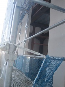 エレベータ設置場所には壁が作られました。まだ足場やネットなどで覆(おお)われているため全体の様子はつかめません。ただ大型のクレーン車を使い、作業が進められています。