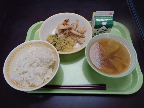 メニューは「米飯・牛乳・鶏肉の照り焼き・切干大根のサラダ・のっぺい汁」です。