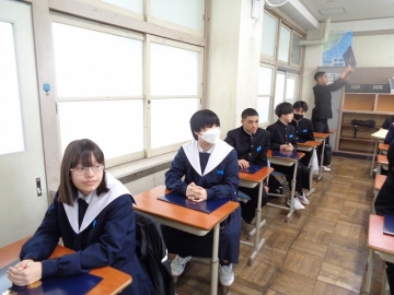 担当の先生から、南海トラフ地震など巨大地震に対する備えの大切さや四日市市の防災の取り組み、そして先生の家の防災グッズなどについて写真や図を使いながら説明がありました。