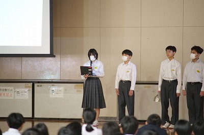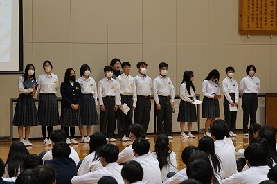 本日の還流報告会は、大池中学校生徒会が大切にしている取り組みです。今年度は生徒会役員と一緒になって有志ボランティアメンバーも全校生徒のみなさんにむけて、交流会の報告を分かりやすく可視化した資料をもとに発表をしてくれました。きっと今日の報告会を受けて、「来年度は自分も参加してみたい!」と思ってくれる仲間も絶対にいたと思います。それだけ、心のこもった報告会であったと思います。