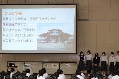 本日3月25日(水)1年間最後の授業。全校集会として2年生、1年生全員が体育館に集まり、生徒会本部役員が主体となった『三重県立特別支援学校 北勢きらら学園』との年間を通した交流会の還流報告会を実施しました。生活会活動の子どもたちが主体となる大切な取り組みの1つである「北勢きらら学園との交流会」。