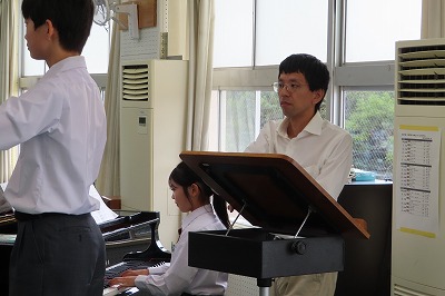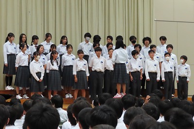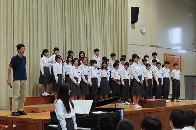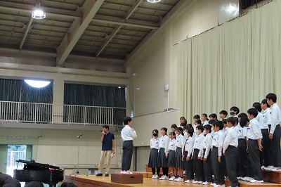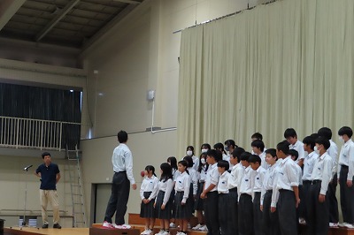 3年生5組・3組の子どもたちは一海先生の合唱指導を受け、1時間という短い時間の中でも、一緒に歌いながらも、ポイントとなる個所を何度も繰り返し指導をしていただきました。男性パートの大きな歌声がしっかりと出て、声の抑揚を、きれいなハーモニーを求めていくとどんどん変化が出て、聴いてる側が「きれいなハーモニーになってきた!」と思えるようになってきました。3組の合唱指導の際には、「クラスで、そして自分たちで大事にしたい歌詞こそ、丁寧に歌ってほしい!」と一海先生。また、合唱の中で一番チカラが入る歌声のときには、からだ全体を使いながら指導していただいている姿が印象的でした。一海先生は、合唱指導の中において、指揮者へのアドバイスも丁寧にしていただきました。素直で一生懸命な3年生の子どもたちは、一海先生の熱心でわかりやすい指導をうけて、どんどん笑顔になり、どんどん歌声がかわり、どんどん意識が変わっていくのがわかります。授業後も一海先生にアドバイスを受ける子どもたちもいました。真剣そのものでした。それだけ、合唱コンクールに向かう3年生の前向きな気持ちをさらに高めていただいたことにつきると思います。