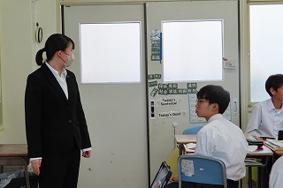 教育実習として本校の大切な卒業生である小寺先生が母校に7年ぶりに帰ってきてくれました。小学校教諭・中学校教諭免許を取得を目指す大切な2日間の実習です。大池中学校では、英語教育と担任業務等に取り組んでもらっています。今日11月13日(木)は2年5組にて「英語授業」を担当してもらいました。