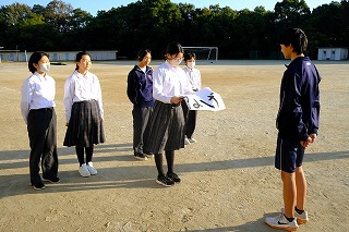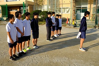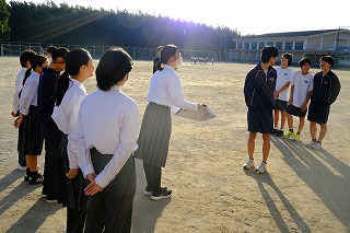三重県中学校駅伝競走大会を2日後となった昨日11月14日(金)の放課後。夕日に包まれたグランドでは、生徒会本部役員の皆さんから、男子駅伝部の選手のみなさんに応援旗の贈呈が行われました!