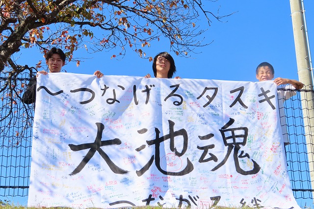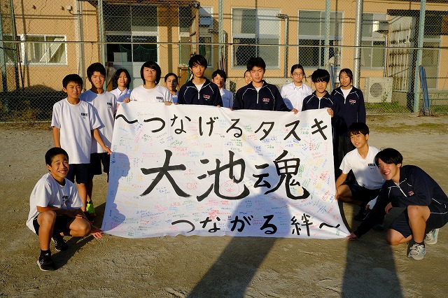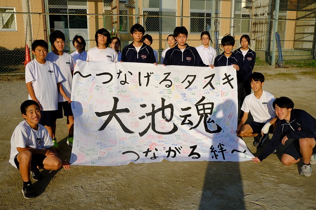 『全校生徒で応援しています!がんばってください!」という言葉とともに、生徒会長から男子駅伝部のキャプテンに応援旗が手渡されました。全校生徒530名の心あたたまるメッセージがいっぱい!勇気をもって全力で頑張る背中を押してくれるメッセージがいっぱい!応援旗には、大池中学校の子どもたちの優しくてあたたかい心がいっぱいです。
