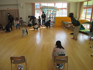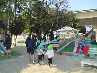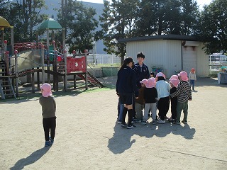 家庭科の事前学習を積んでの保育体験。緊張もあったと思いますが、一人一人が幼児への関わりを考えた工夫したりしながら・・・。言葉はもちろんこと、思い切りのジェスチャーを交えて、優しい声掛けをしながらかかわります。その様子は写真でもよくわかると思います。その姿は、幼児を楽しませようという気持ちだけではなく、自分たちも一緒になって楽しむこと、一緒になって遊ぶこと、一緒の目線で考えることができているように思いました。この姿は、先週の3年5組の子どもたちも同様だったと思います。3年生のこどもたちが「保育実習」を本当に楽しみに、当日のイメージを持ちながらそれぞれが見通しを持って事前学習に取り組んできた成果だと思います。