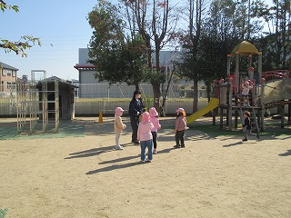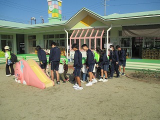 秋晴れのとっても気持ちの良い天気の中、天気と同じくらいの笑顔いっぱいの大池中学校3年2組の生徒の姿がいっぱい。緊張の中にも、「あがた保育園」の先生方のアドバイスとご指導を受け、子どもたちはすぐに幼児の中に入っていきます。幼児とできる限り近い目線を意識して自分からかかわりを求めに行きます