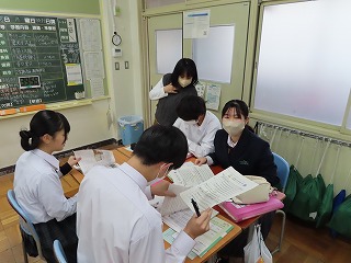 写真のように、授業における半分以上の時間は、グループワークによる「後置修飾」をポイントに置いたアクティビティのある活動です。子どもです。たちは、前時までに学んだ、現在分詞・過去分詞の後置修飾及び間接疑問文の構造を理解しながら、アクティビティな活動を楽しみながらの学びをすすめていました。
