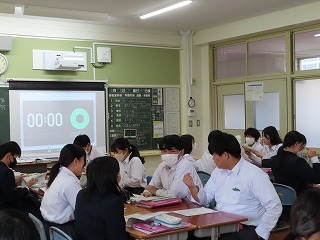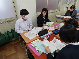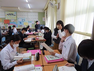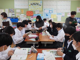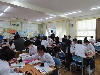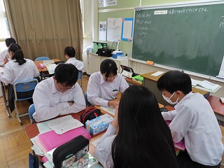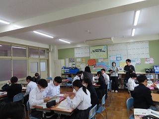 昨日の3年4組の英語授業は、大池中学校の教員研修における「研修班(先生たちの班活動)」の学び合いの活動にもなっている授業でした。校長をはじめ、3学年以外の学年担当の先生も授業に入り、子どもたちの学びの場を活用しての先生たちの学習と研修にも貴重な1時間として活用させていただきました。