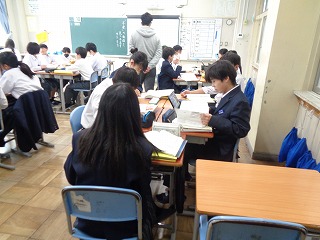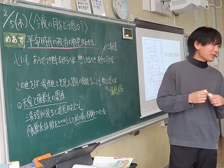 先週2月6日(金)1年2組の社会科の授業の様子から。授業担当の先生の提案授業として(大池中学校教員研修の小グループの学び合いから)、『他者との関わり合いを探求する授業づくり』という研修グループテーマのもと、1年2組において平安時代『摂関政治』が単元となる授業を展開してくれました。