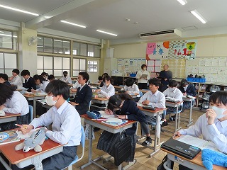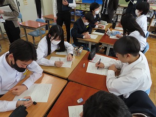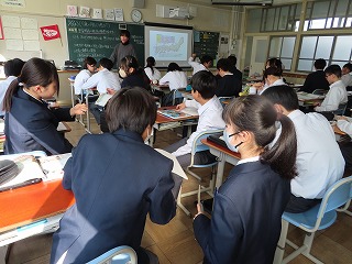 現在2年生では「人権学習」に取り組んでいます。昨日2月10日(火)6限目の2年5組の授業は人権学習に取り組みました。本来は、2月3日(火)に大池中学校教員研修会の提案授業として実施する予定でしたが、インフルエンザ感染拡大に関わる学級閉鎖により延期となっていた授業です。