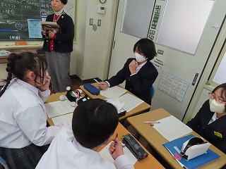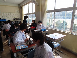 本日2月12日(木)の3限目と4限目の2年2組の家庭科授業の様子から。2年生の家庭科授業は「調理実習」に入りました。2組の授業が調理実習のスタートです。2限続きの調理実習でしたが、4限目の時間の様子しか参観できませんでした。