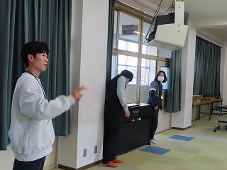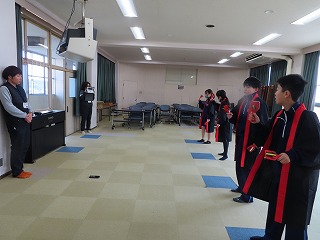 本日2月12日(木)の2限目。校舎北館3階の視聴覚教室からは、軽快なダンス曲と鳴子(なるこ)の音が聞こえてきます。8組の子どもたちが、明日2月13日(金)の午前中に開催される「第39回 三泗小・中学校特別支援学級学習発表会」に向けて、仕上げの練習を、担任の先生と一緒に集中して取り組んでいました。この2限目は、交流学級の授業参加している子どもたちもいることから、写真では4人での活動になっていることを申し添えます。