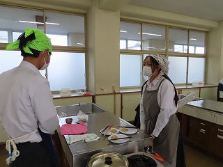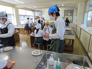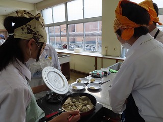フライパンで調理する焼売を、心配で、何度も何度もふたを開けながら様子を見る男子生徒に対して、「ふたを開けすぎ!」という声をかける女子生徒。手際よく、「まな板洗っておいて!」「きれいに盛り付けしよ!」という女子生徒の声・・・。このように、「ほっこりとする様子」もありましたが、男子生徒も積極的に頑張って取り組んでいます!2組の授業には、みんなで一生懸命に頑張る雰囲気が調理実習からもしっかりと伝わってきます!みんながあたたかい雰囲気の中で、一人一人に役割があって、みんなで頑張っています!